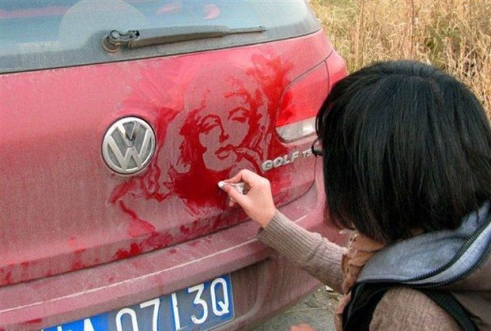 MyDomisil.Com - Keren nih gan, cewek ini melukis dengan media debu di mobil. Setelah kita melihat lukisan Natalie Irish menggunakan bibir, lihat juga : Natalie Irish, Cewek yang Melukis Menggunakan Bibir, kali ini ada cewek yang melukis debu tapi pada body belakang mobilnya. Pokoknya keren deh nih cewek, yup dari pada penasaran yuk liat aksinya..
